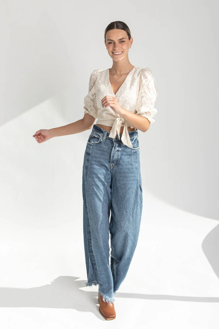 This wrap style top is cream-colored with burnout lace texture. It has a cropped length with a tie at the bottom. It is a great alternative to a typical tee. It can be dressed up or kept casual. Â