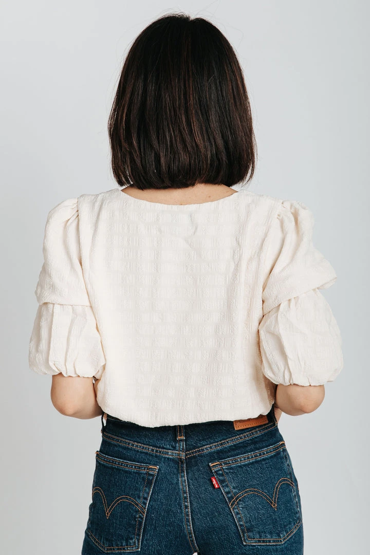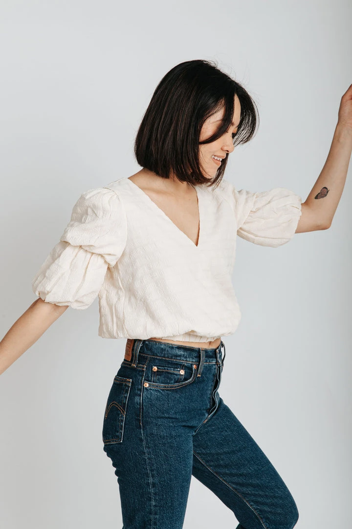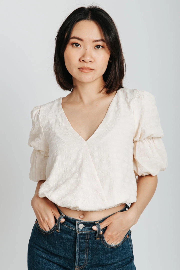 The Danae Woven Puff Sleeve Blouse has an ethereal look with its simple silhouette + earthy neutral color. It has a faux wrap-style neckline with tiered puff sleeves. It is cropped with an elastic hemline.