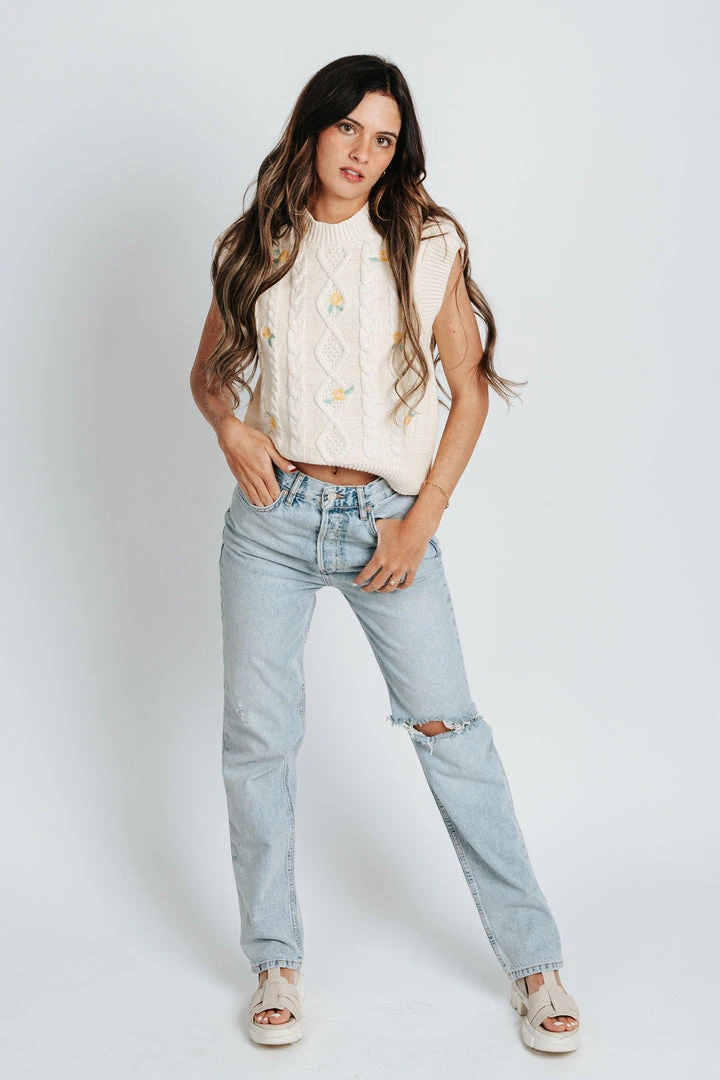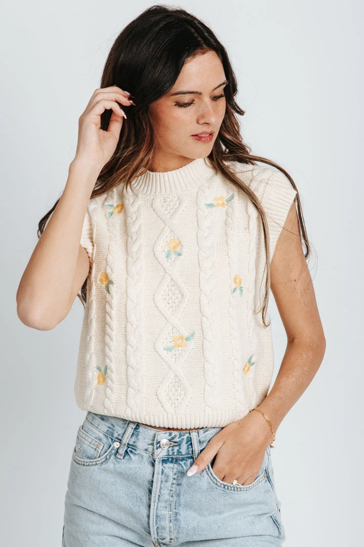 A classic cable-knit sweater with embroidered flowers. It has a high neckline with a cropped waistline. The Ellsworth Sweater Vest can be layered + works well for spring.