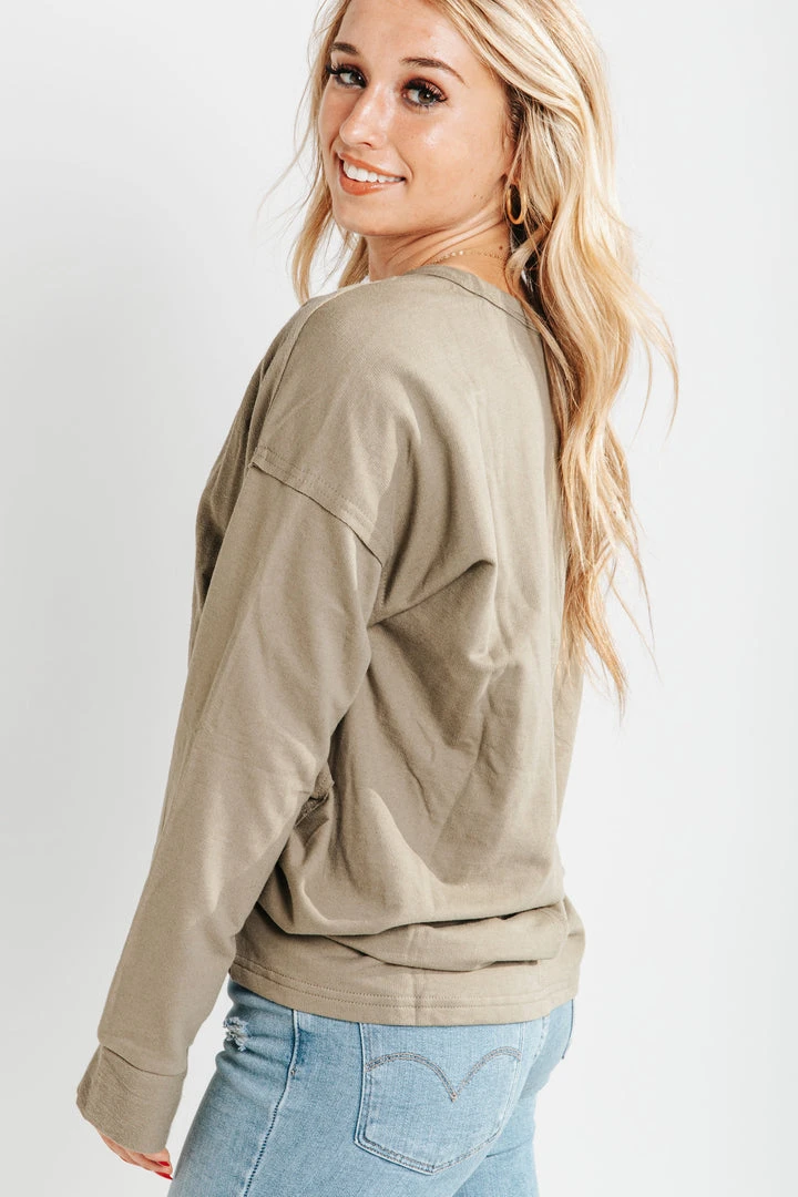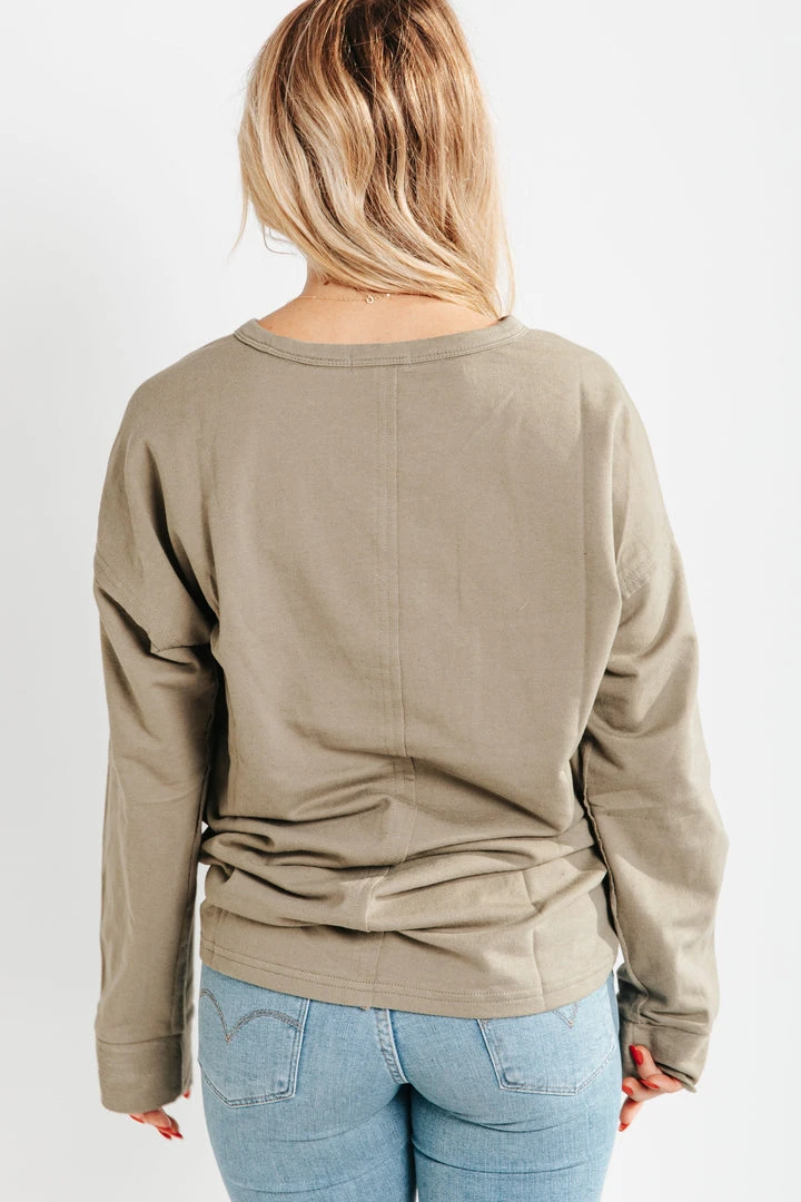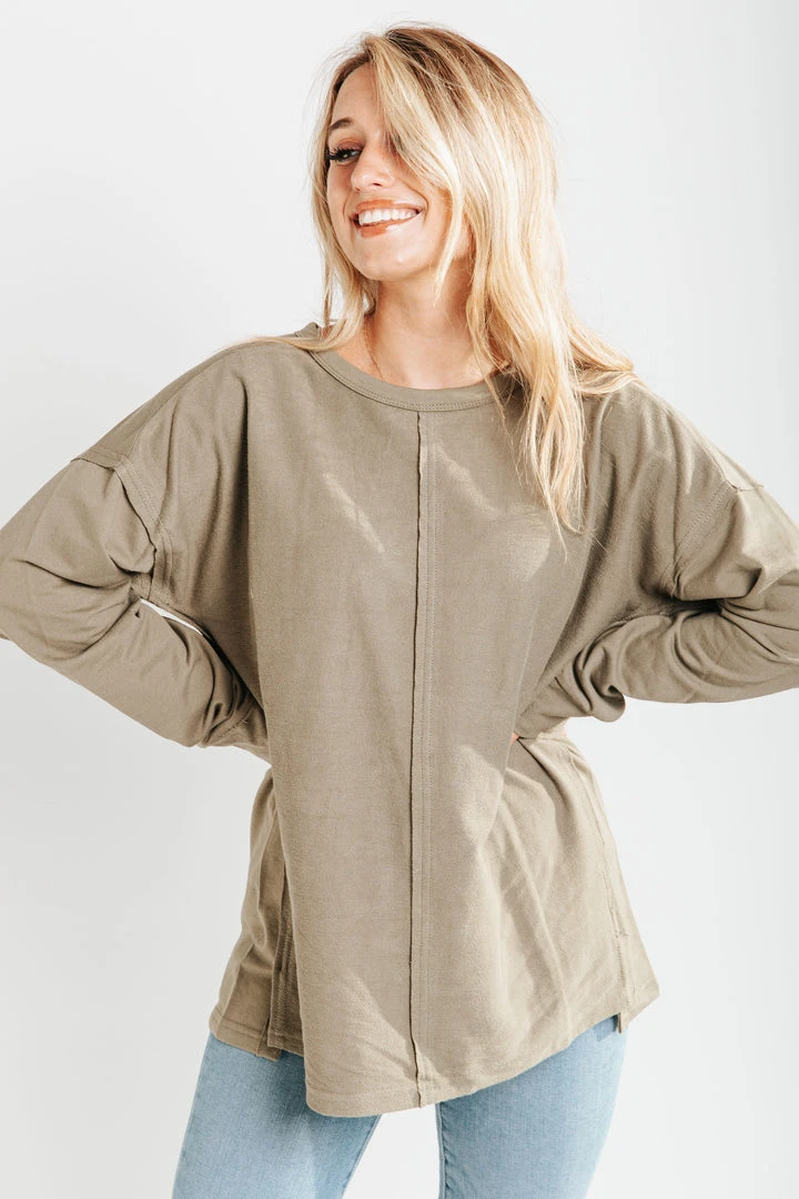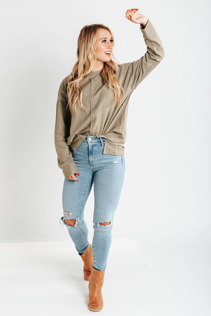 The Ferguson Casual Top is one you’ll want to wear every day for the following reasons: it is comfy, it is an earthy olive, it has a slouchy fit with exposed seams.