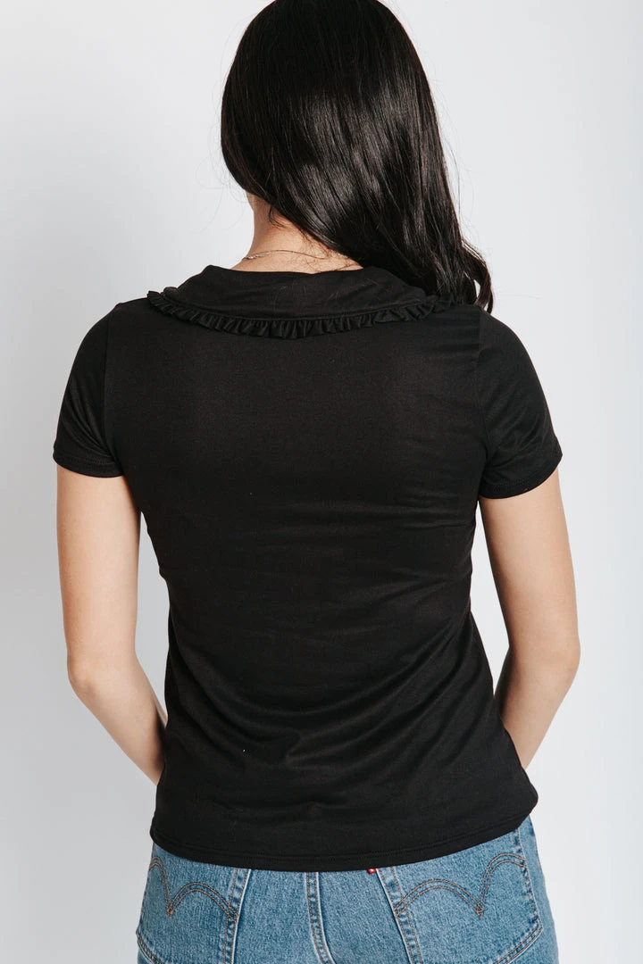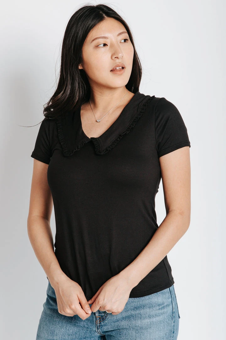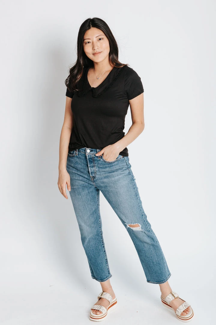 Collars are IN and we don’t want to go without The Gabe Collared Blouse. This black blouse offers a detailed collar that frames your clavicle + elevates your look. It has a stretchy fit + a traditional length.Â