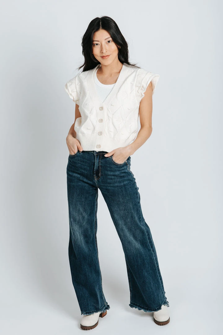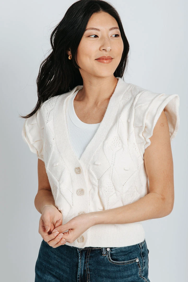 This classic cardigan has a ruffled cap sleeve with a textural knit. It has buttons down the front + a cropped length.