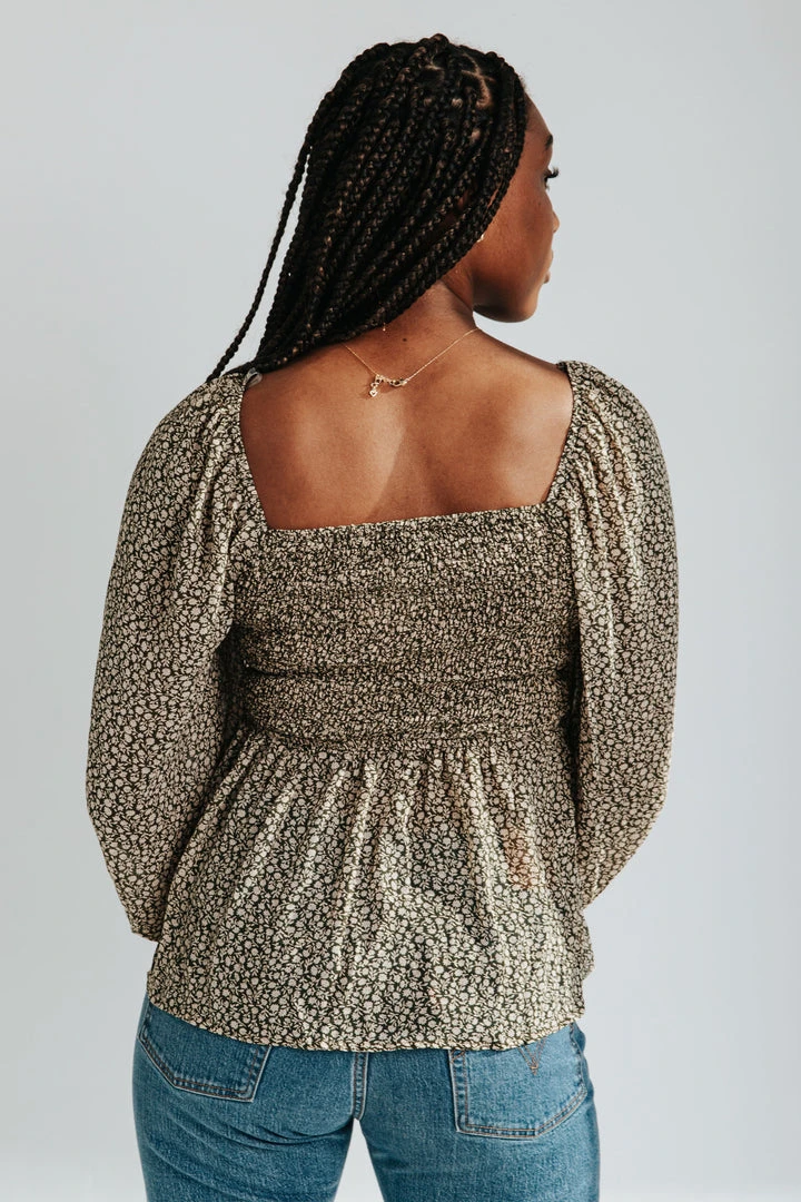 The Konrie Smocked Floral Blouse is a rich olive color with a ditsy floral print. It has a smocked bodice, long sleeves with elastic cuffs, and a swingy fit with a traditional length.Â