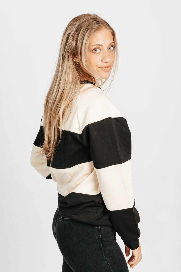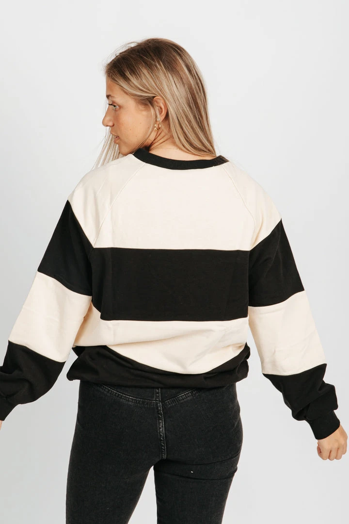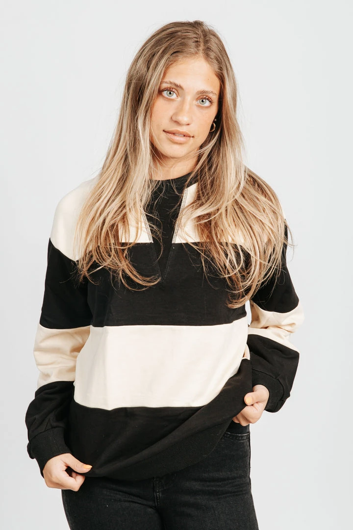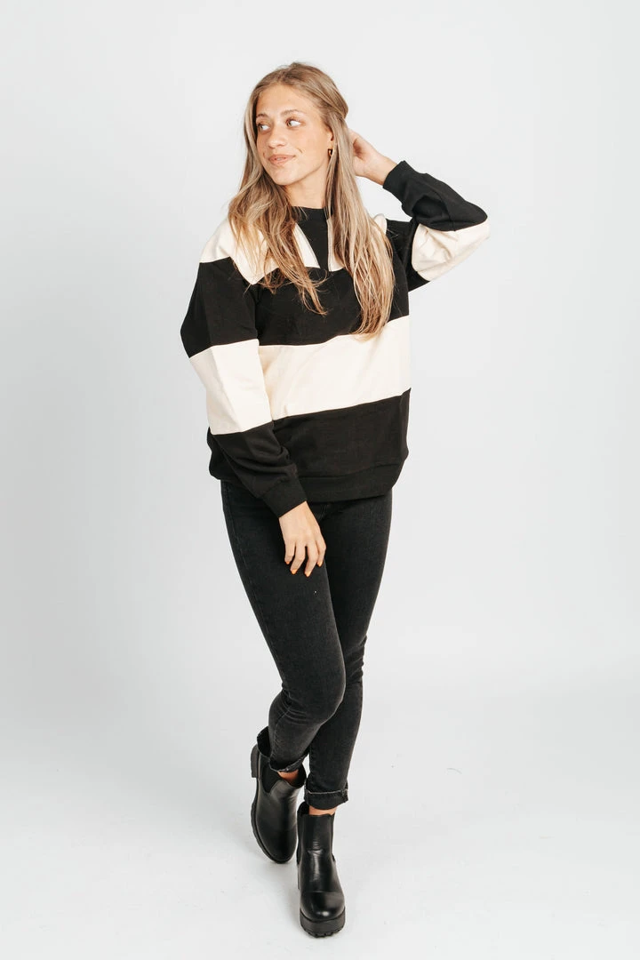 A tried and true color combination AND print. The Linette Striped Pullover is black + cream stripes made from stretchy material. This pullover provides a simple style that will always be popular.