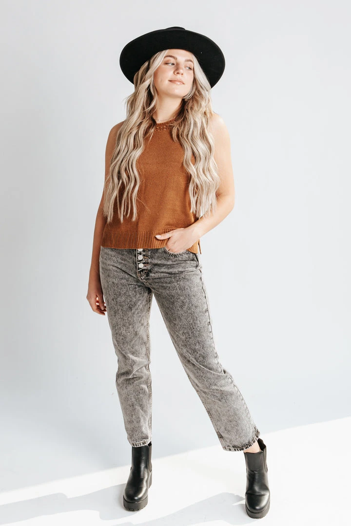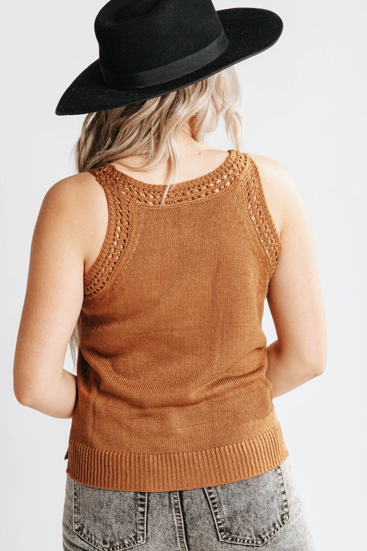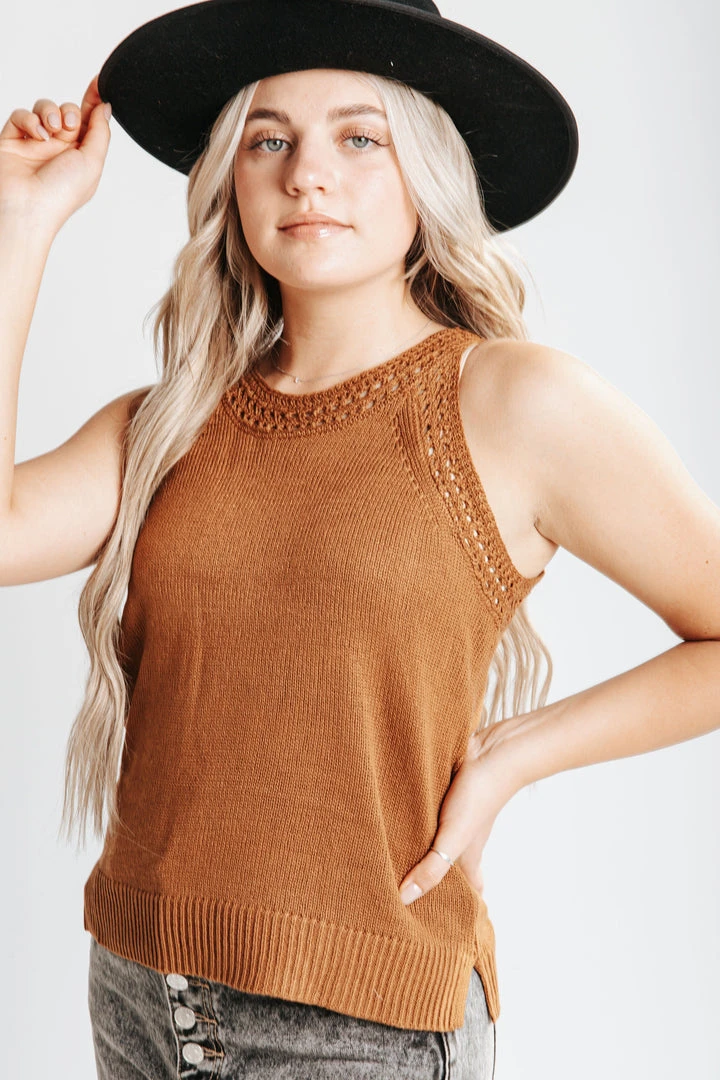 The Luna Crochet Tank Blouse is camel-colored with a crochet neckline. It has a ribbed hemline with side slits. It has a slim fit + slightly cropped length.Â