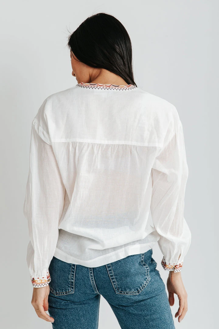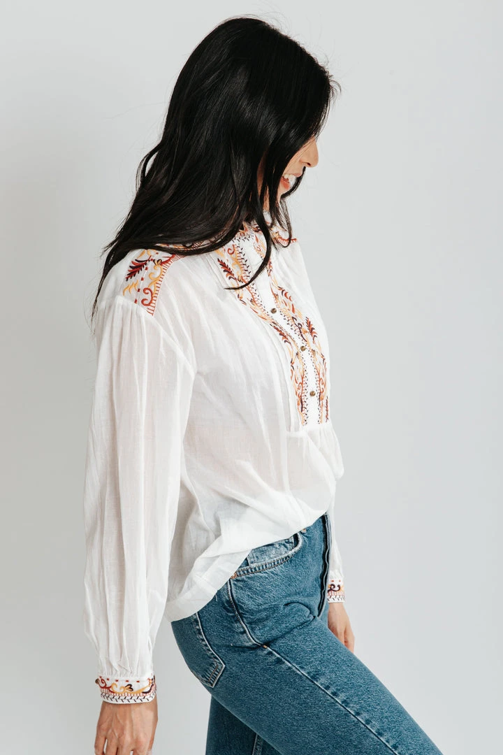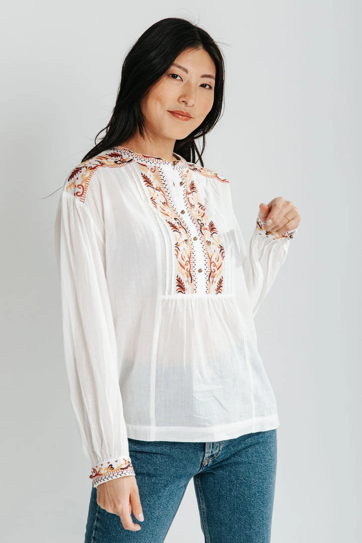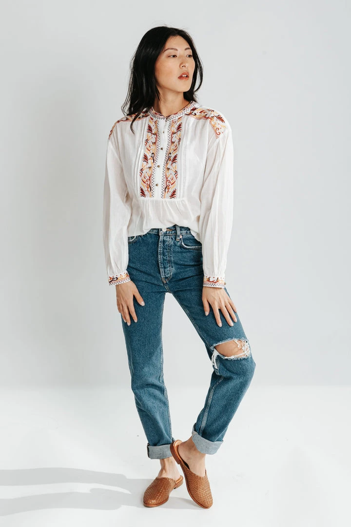 The Lundenburg Embroidered Blouse is cream-colored with a banded collar, buttons down the top half, and colorful embroidery along the shoulders + down the front. It has long sleeves with a traditional length + fit.Â