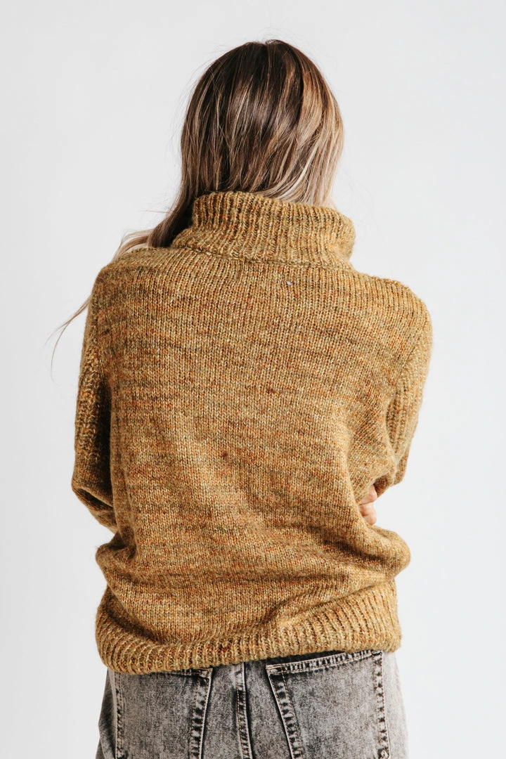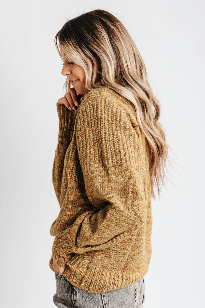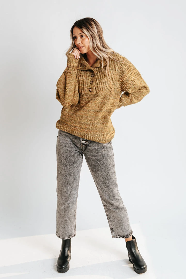 The Naja Woven Sweater has a hand-knit look with subtle speckled fabric. It has buttons down the front half with a collar. It has a relaxed fit.Â
