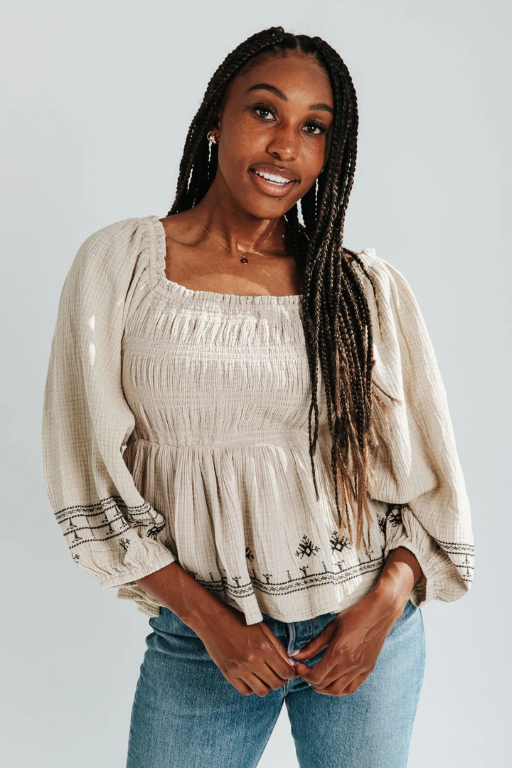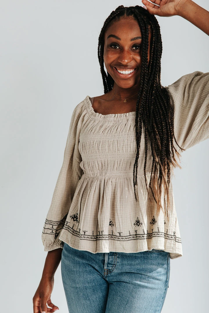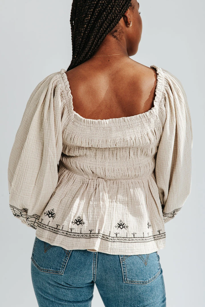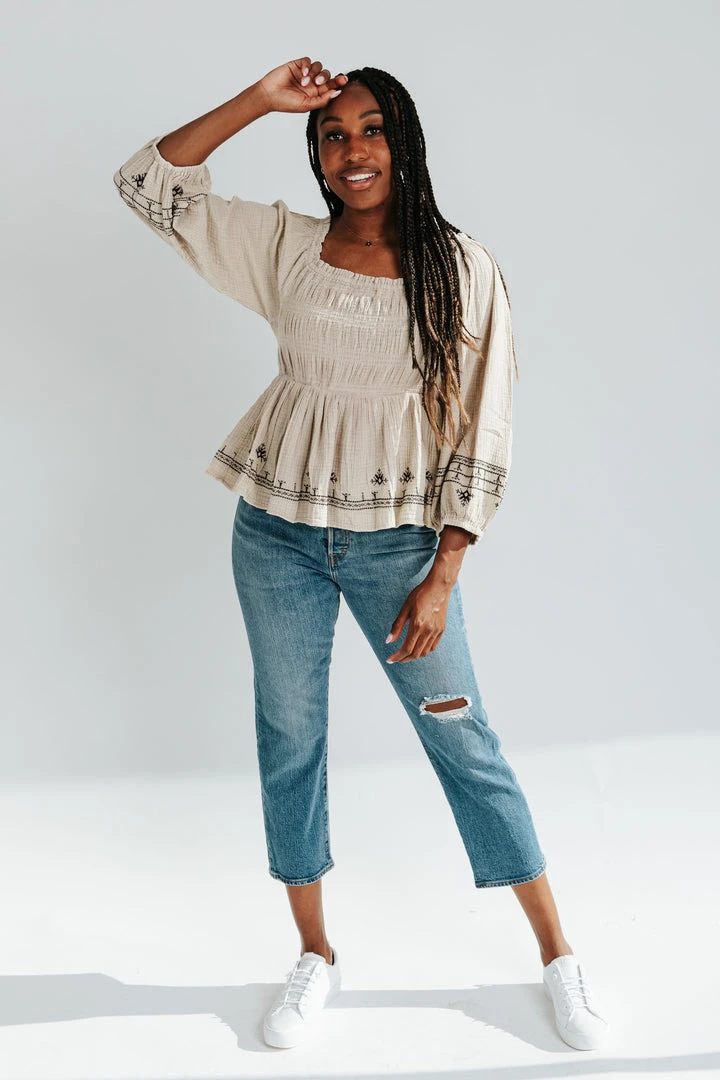 The Nanette Embroidered Gauze Blouse features navy embroidery along the sleeves + peplum hemline. It has an elastic neckline + a stretchy ruched bodice.Â