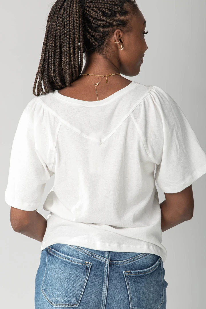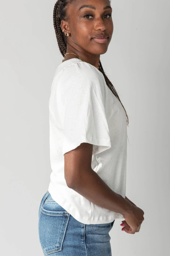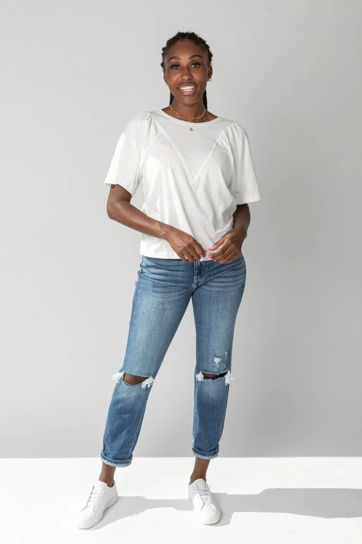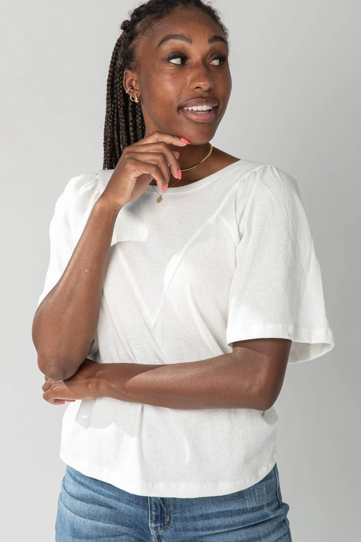 An elevated tee. The Oswell Flutter Sleeve Blouse has breathable + flattering sleeves. It has a traditional length + fit. Dress it up or down but it’ll be your new go-to top.