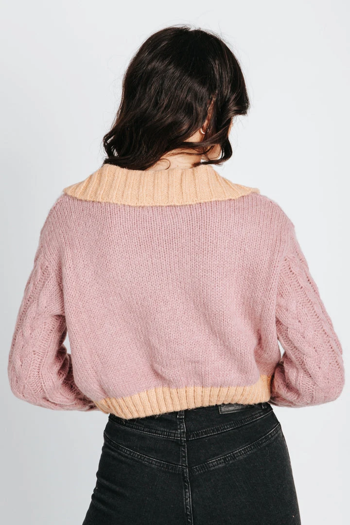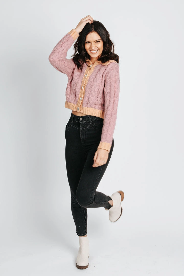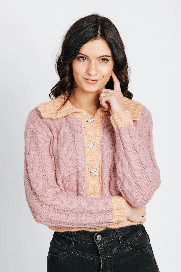 Two-toned with a side of sparkle. The Pompeo Cable Knit Cardigan has flower-shaped crystal buttons. It has a contrasting collar, sleeve cuffs, and hemline. It has a slightly cropped length.