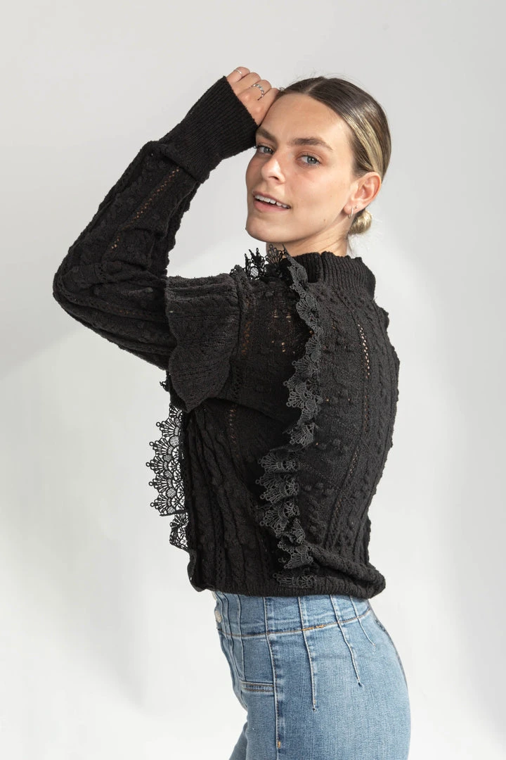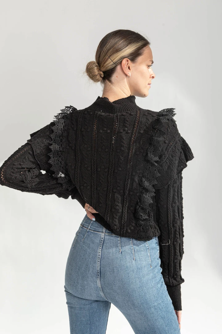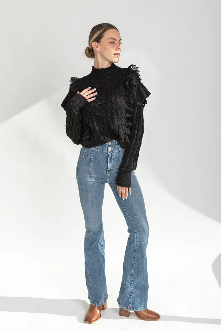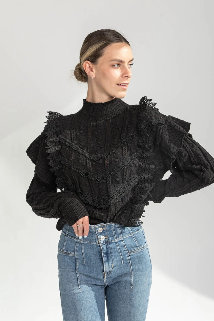 The Prescott Ruffle Detail Sweater has textural detailing in a beautiful black color. It has a high neckline with a traditional length + fit.