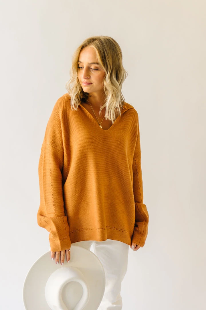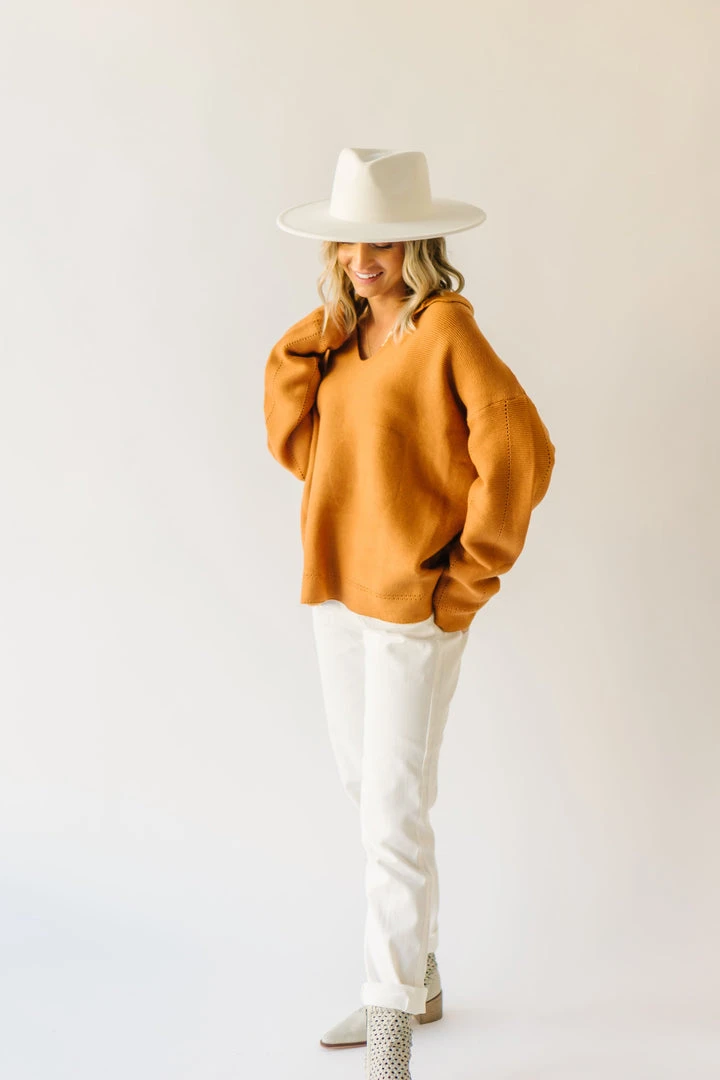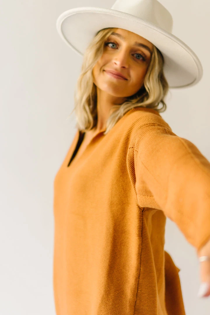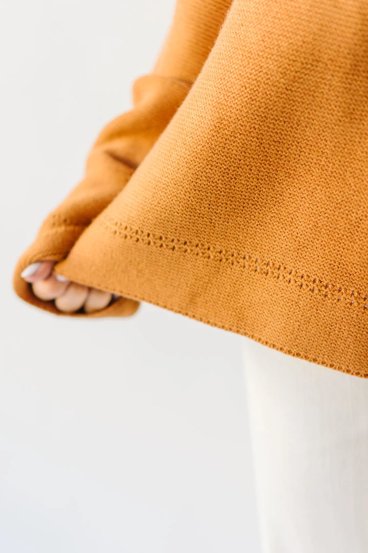 The Rue Textured Sweater is a rich butterscotch sweater. It is a stretchy knit with an oversized fit + longer length.