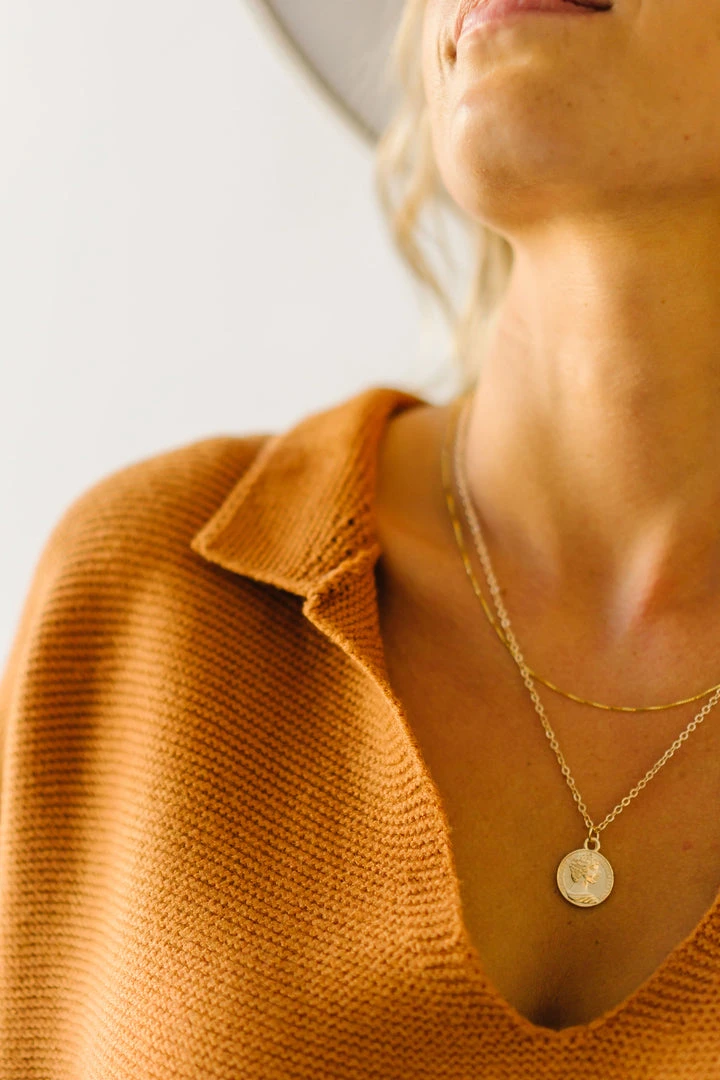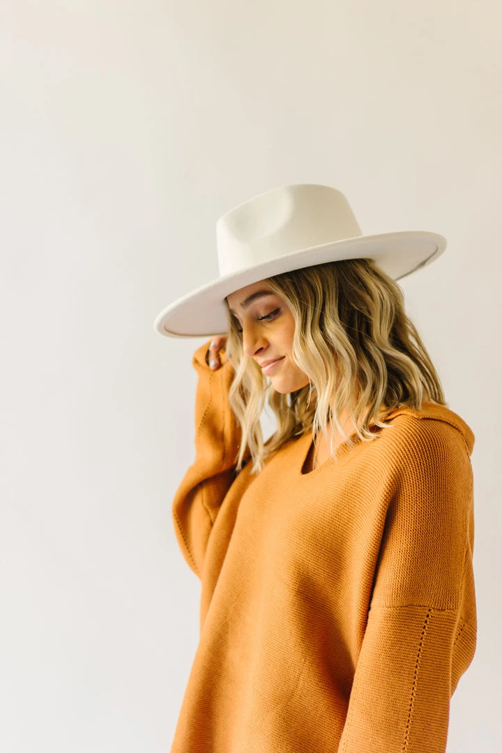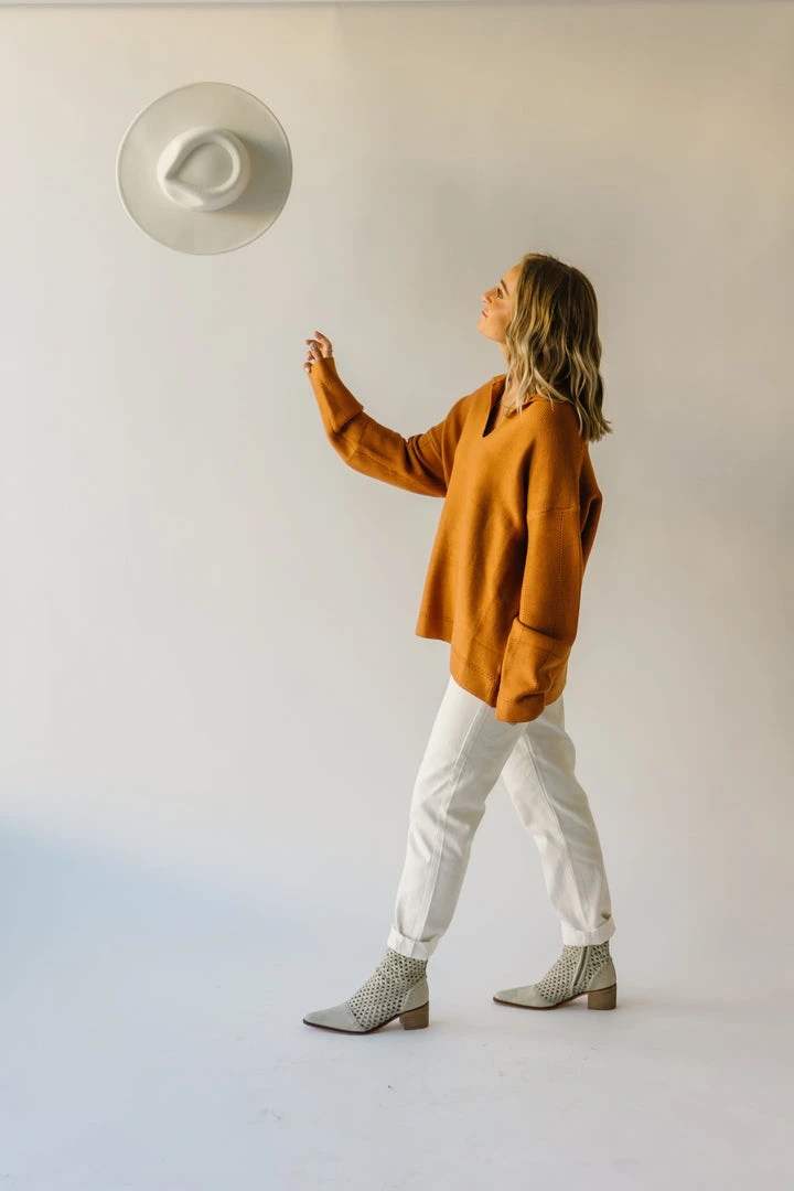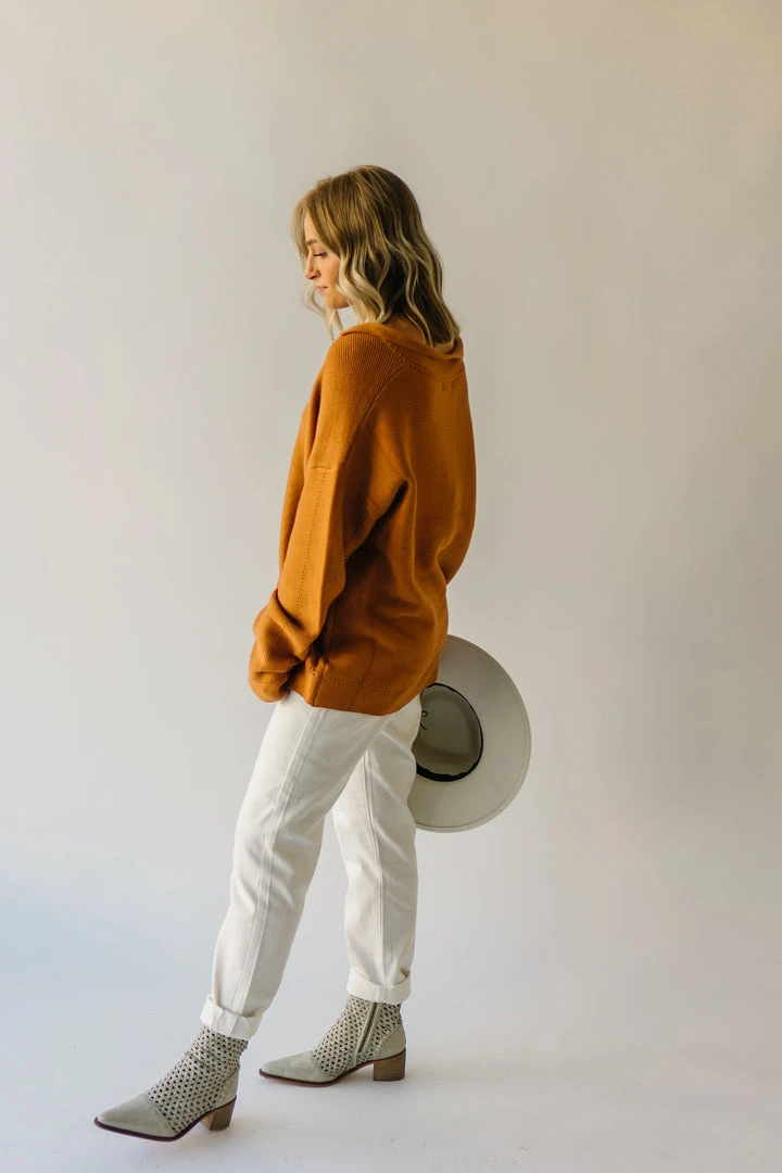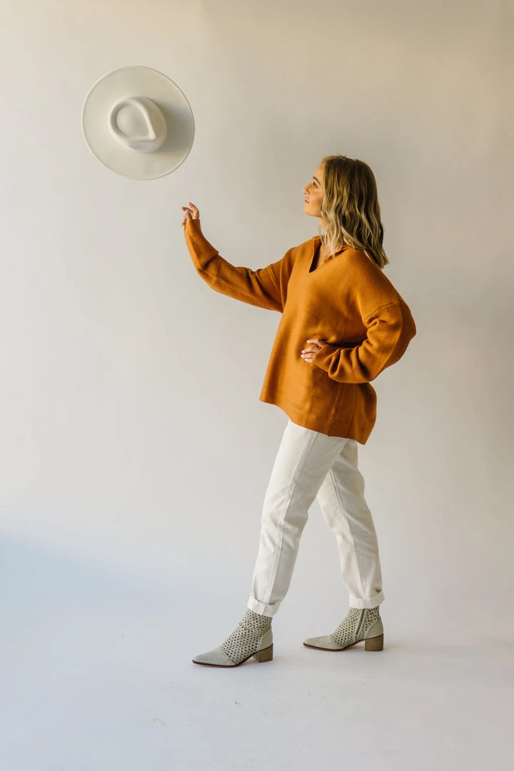 The Rue Textured Sweater is a rich butterscotch sweater. It is a stretchy knit with an oversized fit + longer length.