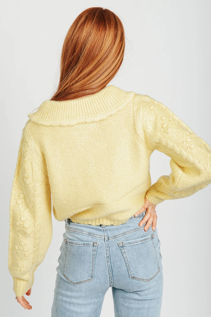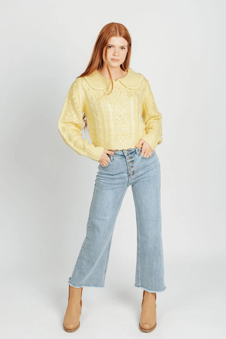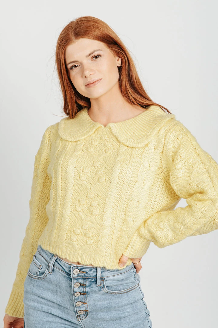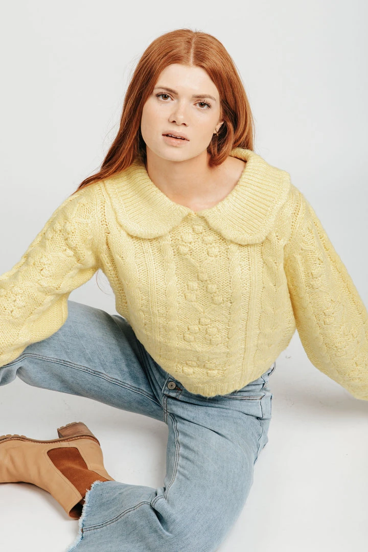 The Sims Scalloped Sweater has a sunny disposition. It is a textural knit in a pale yellow color with a peter pan collar. It has a scalloped + cropped hemline.Â