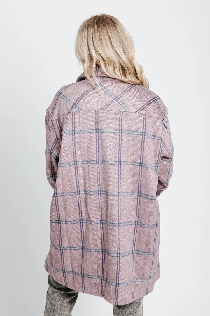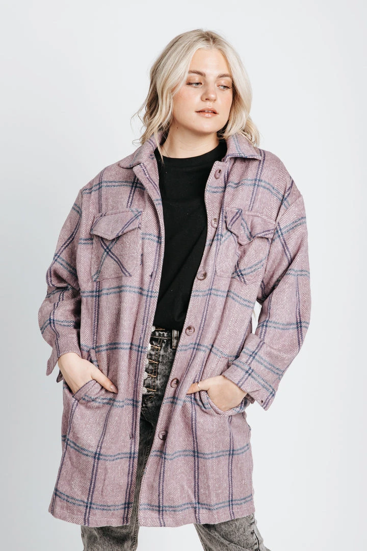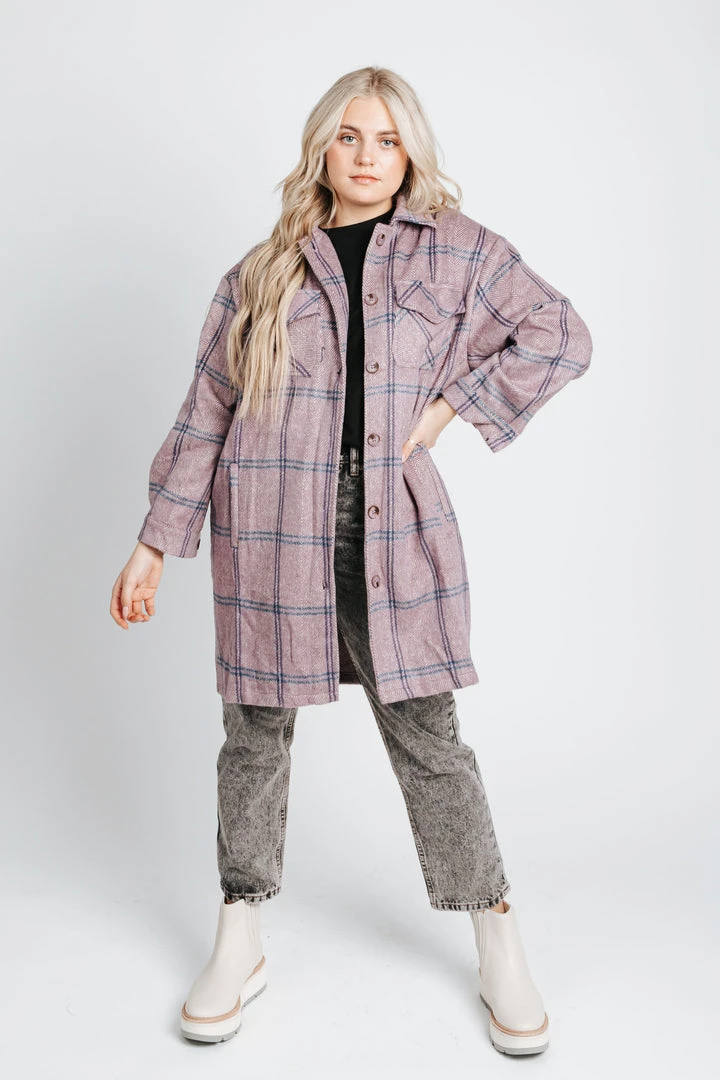 Purple plaid perfection. The Stroma Plaid Jacket is a long + oversized jacket with a collar + buttons down the front. It has front pockets + hidden side pockets.Â