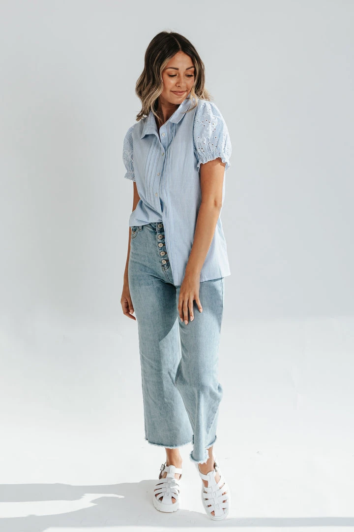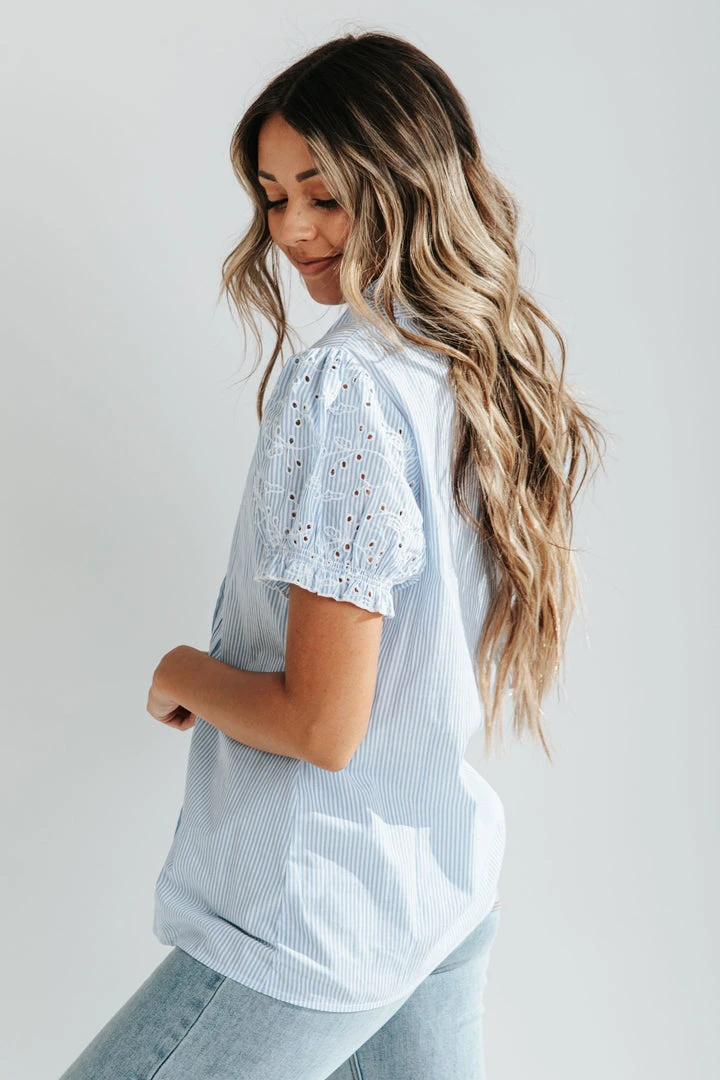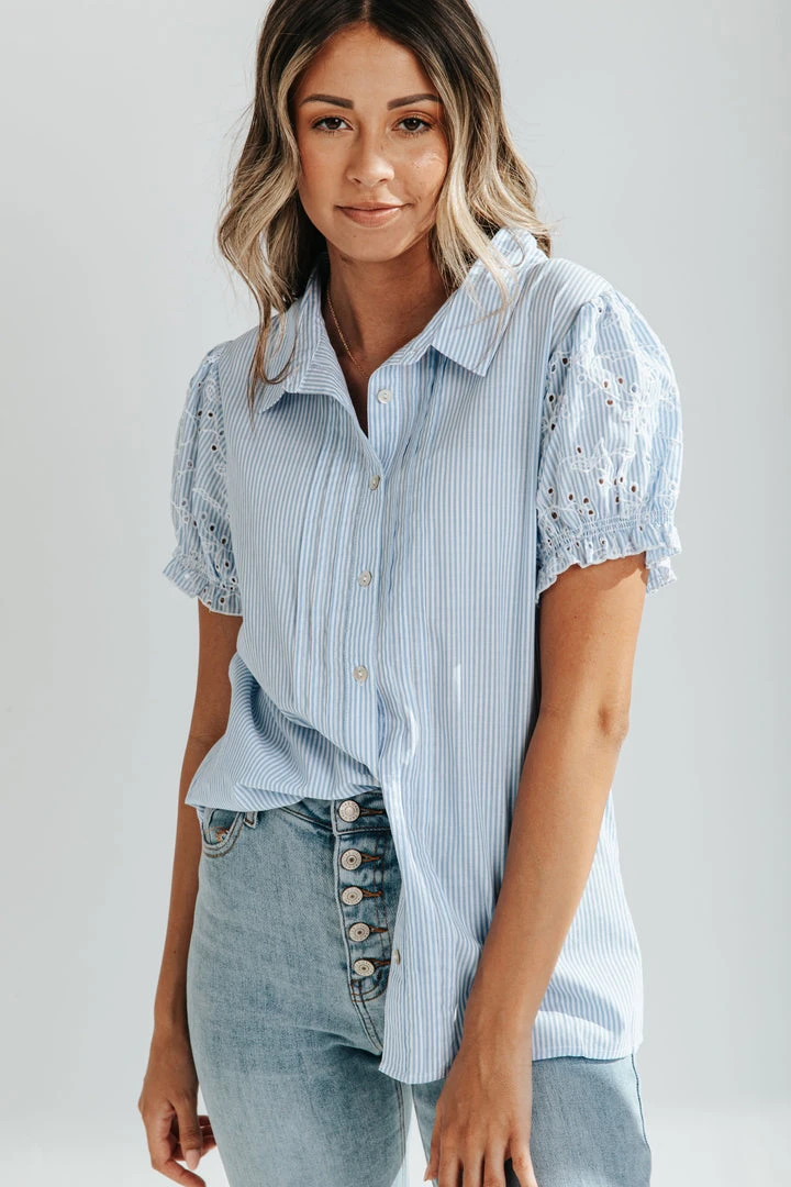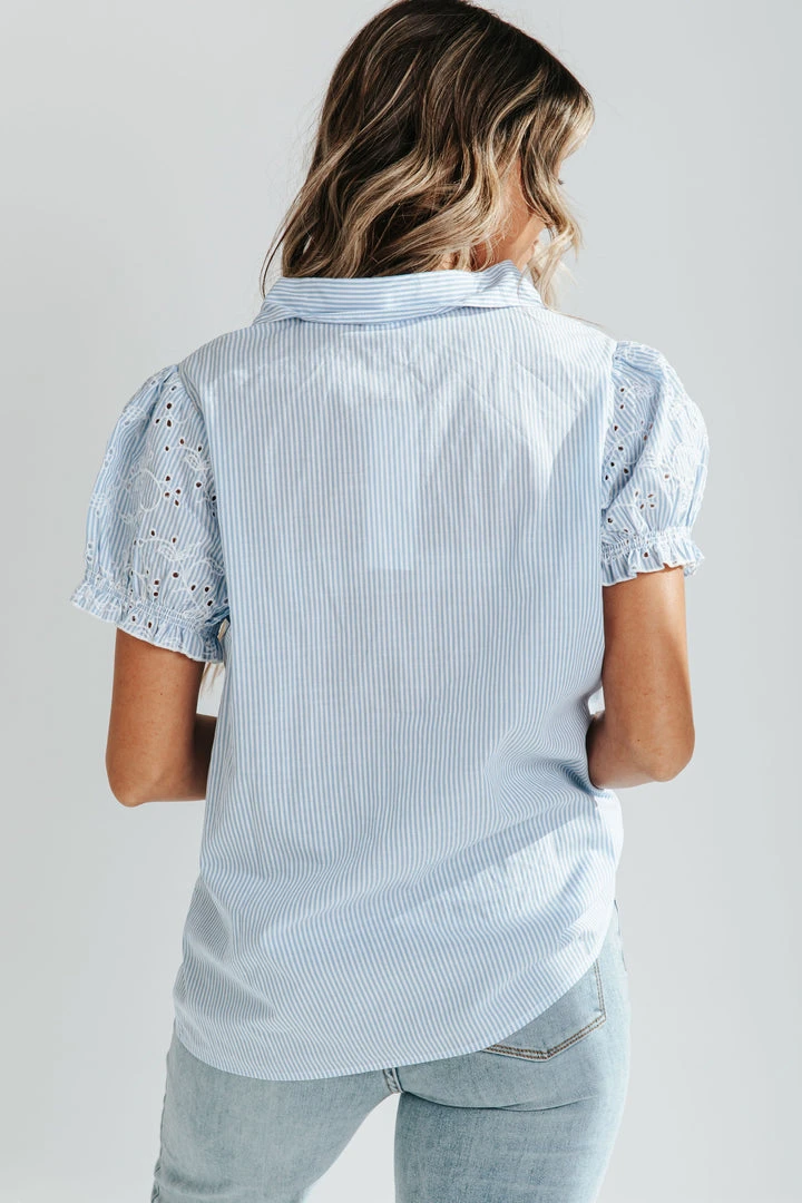 Tailored + timeless. The Tony Eyelet Sleeve Striped Blouse has a collar with buttons down the front. It has eyelet puff short sleeves. It has a traditional fit + length. The pleated detailing + vertical stripes offer flattering details.Â